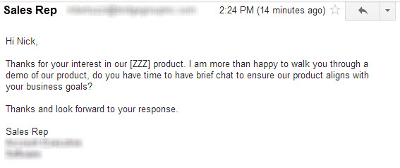 - The ugly: Rather than stick to his original commitment, he decides to back pedal and use the old “price as a qualifier” sniff test. This technique just doesn’t play well over email. It comes across as downright rude and sounds like he is trying to kick Nick to the curb.