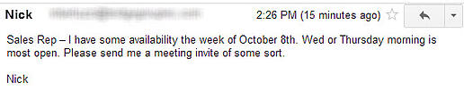 I thought this story might make good fodder for a post stressing the importance of qualifying, when live conversations make sense, and how to screw up a deal with email.