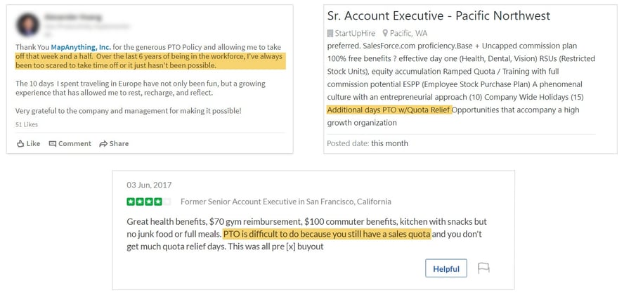 Search for yourself. You’ll find example after example of reps expressing frustration around taking even a week away. My reflexive reaction was “kids these days” and “back when I carried a bag....” But I wonder if I was being too harsh and a bit short-sighted. I found a few examples of reps praising their companies for supportive policies and even a few job descriptions highlighting PTO with quota relief.